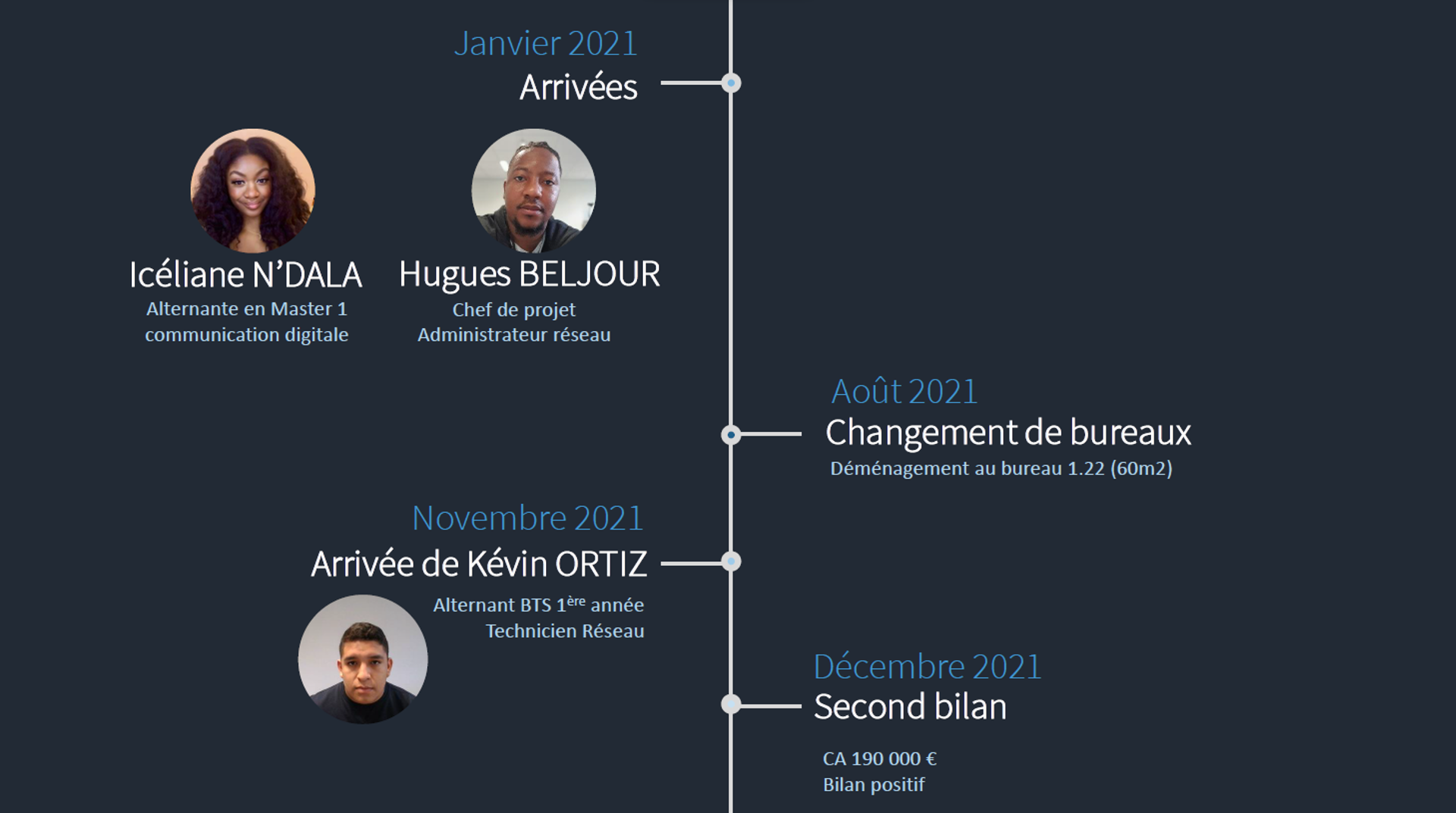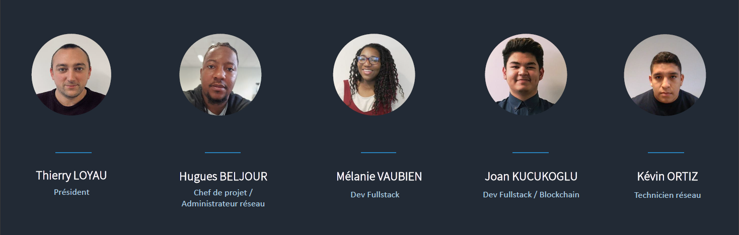 L’équipe informatique est composé du CEO de l’entreprise, Un chef de projet et Administrateur réseau, Une développeuse Full stack, Un développeur Full stack et Blockchain et d’un Technicien réseau.