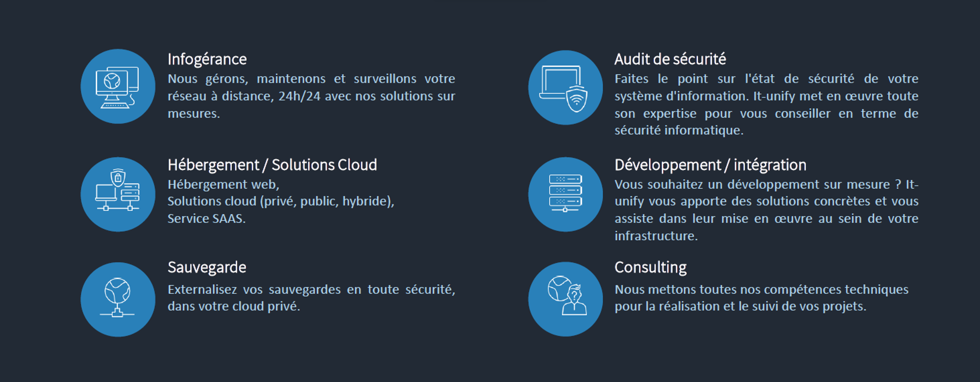 Prestataire IT basé en Île de France, It-Unify est spécialisé dans l’infogérance des systèmes et réseaux, la gestion de projet, le développement web CMS et application métier pour les entreprises. It-Unify a comme mission d'assurer une efficacité permanente et/ou une mise à niveau de vos infrastructures informatiques. Nous vous conseillons sur l’évolution ou le renouvellement de vos solutions.