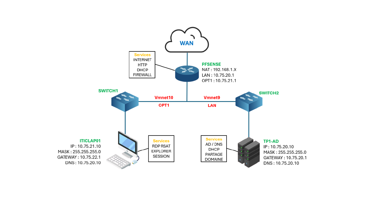 Pour la première partie du TP, nous allons mettre en place une infrastructure réseau virtualisée visant à reproduire un environnement d’entreprise sécurisé. L’objectif est de permettre la gestion centralisée des utilisateurs, des ressources partagées et des politiques de sécurité. L’infrastructure sera composée d’un pare-feu (PfSense), d’un contrôleur de domaine (Active Directory) et d’un poste client. Après avoir configuré un réseau local (LAN) via PfSense, nous intégrerons le poste client au domaine. Nous ajouterons ensuite un second réseau (OPT1) pour simuler un sous-réseau distinct. Le projet inclut également le déploiement de stratégies de groupe (GPO), la configuration des services réseau essentiels (DHCP, DNS, partage de dossiers), ainsi que l’importation d’une liste d’utilisateurs à partir d’un fichier CSV dans l’Active Directory.