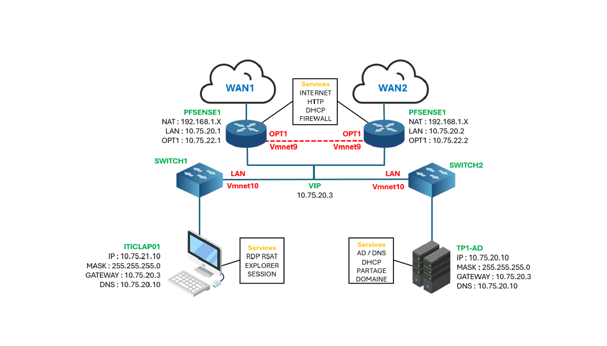 Dans cette seconde partie du projet, nous mettrons en place une solution de haute disponibilité (HA) avec deux pare-feu PfSense configurés en cluster. Cette architecture permettra de maintenir la connexion réseau : si le premier pare-feu rencontre une défaillance, le second prendra automatiquement le relais sans interruption perceptible pour les utilisateurs. L'objectif est d'assurer la résilience de l'infrastructure réseau, d'améliorer la fiabilité du système et de garantir la sécurité et la disponibilité des services pour tous les utilisateurs du domaine.
